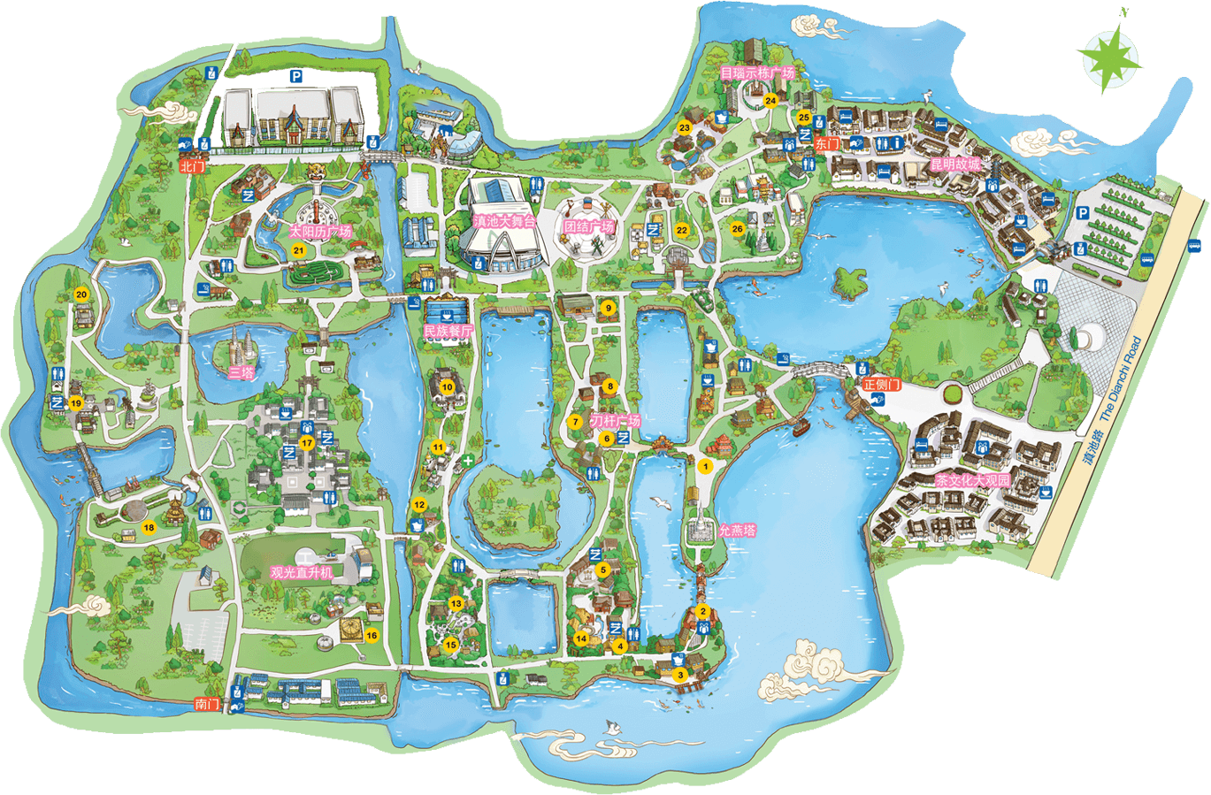佤族人口約36萬,主要聚居在云南省瀾滄江南段以西的阿佤山區(qū)。佤族寨位于“翠漪洲”東南角。寨內分布有茅草頂的干欄式建筑群、牛頭廣場、神靈廣場、司崗里石雕以及糧倉等。牛頭廣場是佤族古老的剽?;顒訄鏊?,場正中的牛角為佤族的寨樁,廣場前的兩個石人分別為佤族的男性和女性祖先。神靈廣場表現了佤族萬物有靈、靈魂不死的自然崇拜觀念。場中兩個石人雕像分別為佤族最崇拜的“木依吉”和“阿依娥”。佤族木鼓舞節(jié)拍鮮明強烈,...